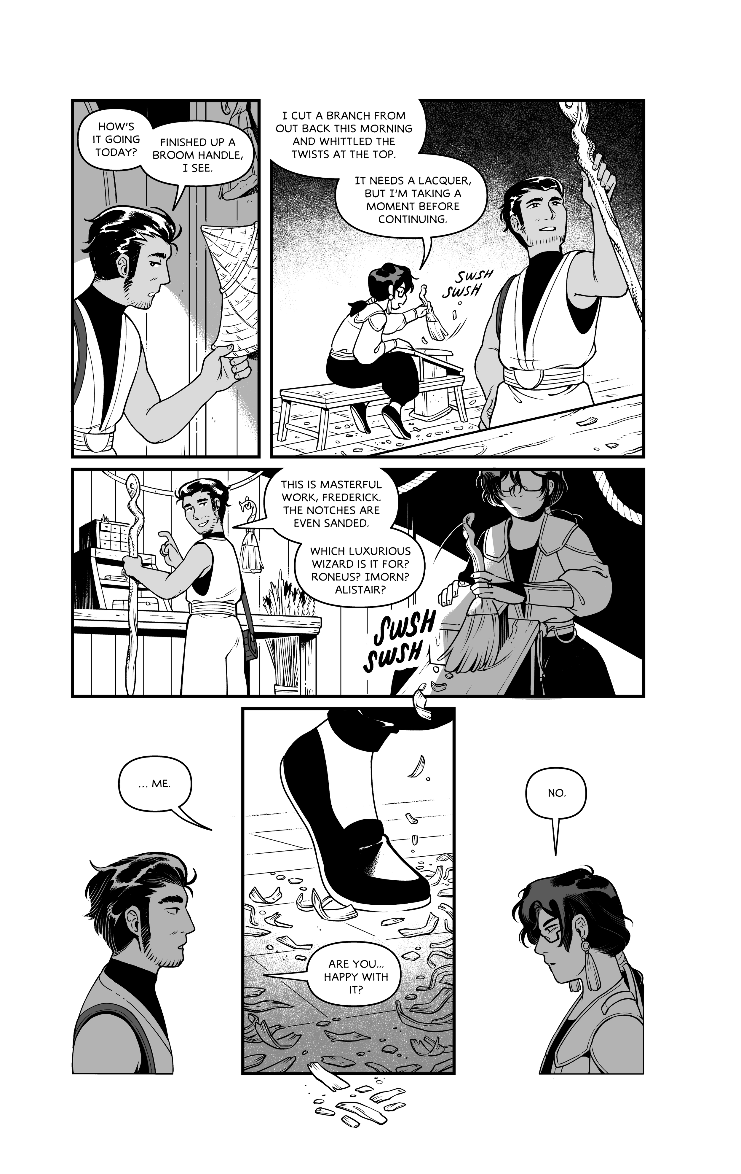 A broomsquire attempts to whittle something for himself and struggles until his pen-turning friend visits his workshop.